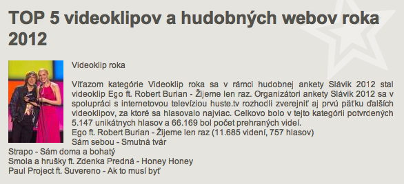 Prvý videoklip od kapely SámSebou na pesničku Smutná tvár sa však nestal víťazom kategórie Videoklip roka v rámci hudobnej ankety Slávik 2012. Umiestnenie tohto videoklipu sa dozvedáme, preto že organizátori ankety Slávik 2012 sa rozhodli zverejniť aj prvú päťku ďalších videoklipov, za ktoré sa hlasovalo najviac. SámSebou s videoklipom k pesničke Smutná tvár sa umiestnila na DRUHOM mieste!!!